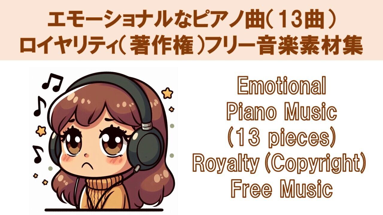 エモーショナルなピアノ曲のロイヤリティ(著作権)フリー音楽ミュージック素材集で13曲収録しています。